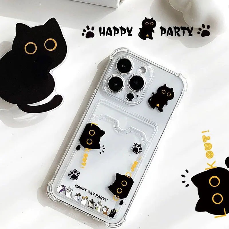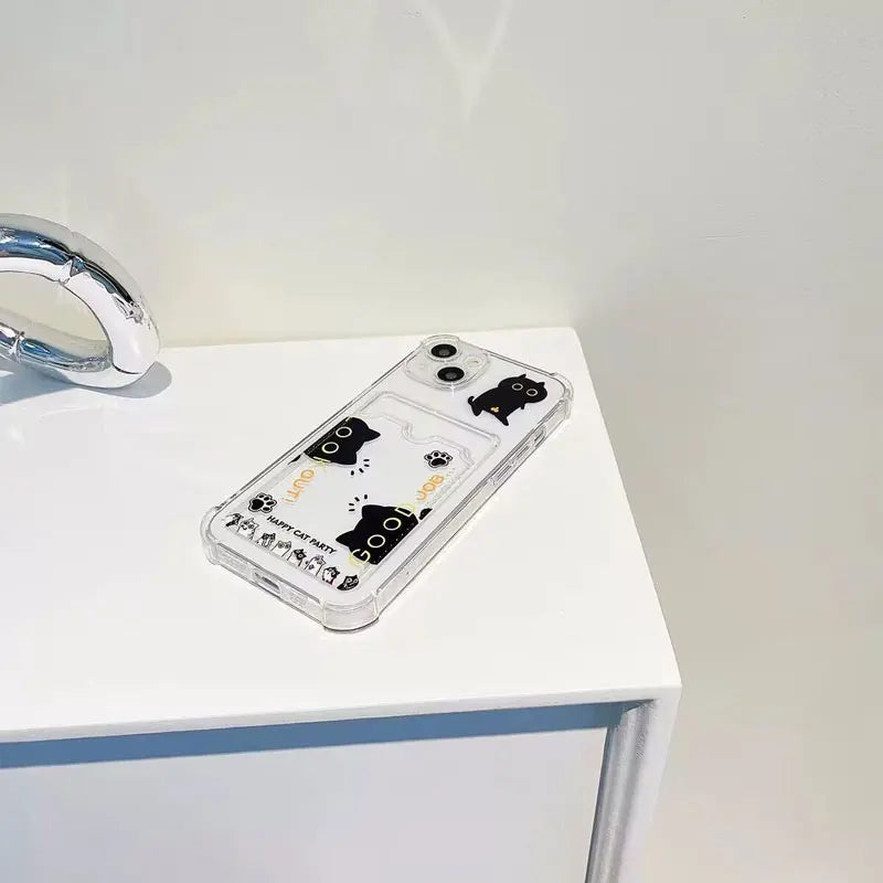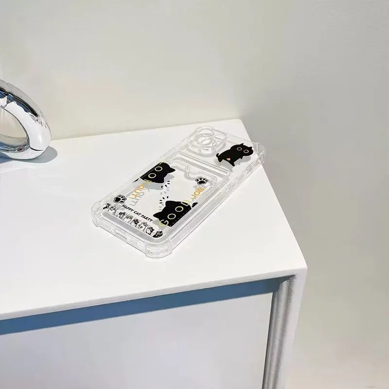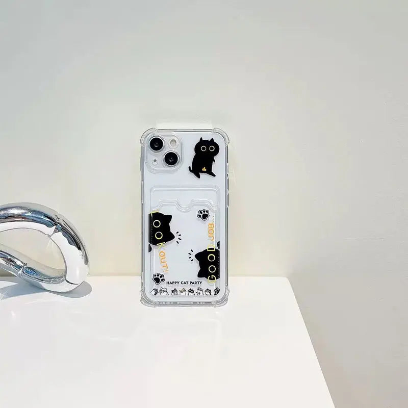 Cute Black Cat Pattern Card Pocket Phone Case For iPhone 16 15 14 13 12 11 Pro Max XR XS 7 8 Plus Shockproof Transparent Cover