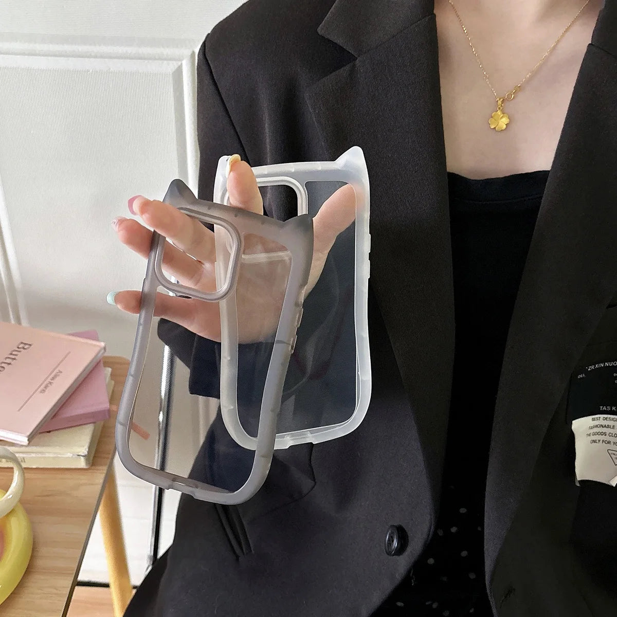 Cute Cat Ear Transparent Phone Case For iPhone 11 15 16 Pro Max 13 14 Plus 12 16promax Shockproof Silicone Matte Funda Cover