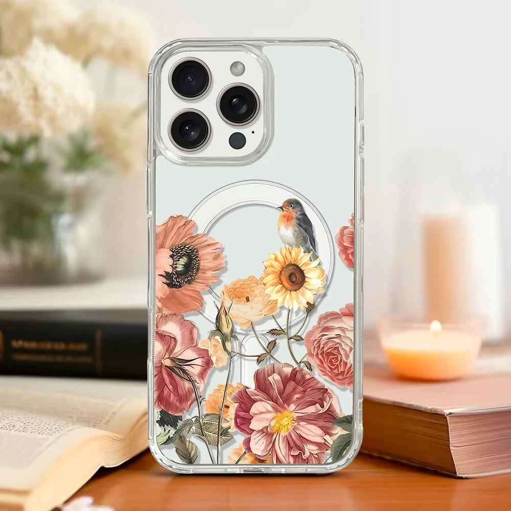 Flowers and Birds Magnetic Phone Case for iPhone 16 pro max 15 Plus 14 13 12 Mini Transparent Case