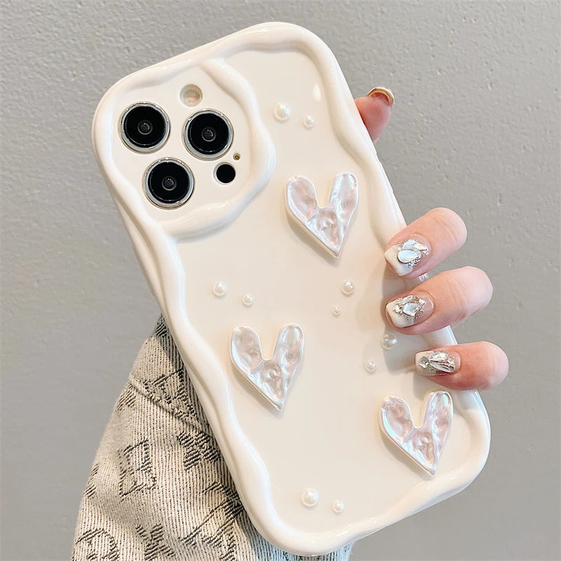 A Korean-style case with 3D pearl love heart design. Soft silicone material provides shockproof protection with elegant pearl decoration.