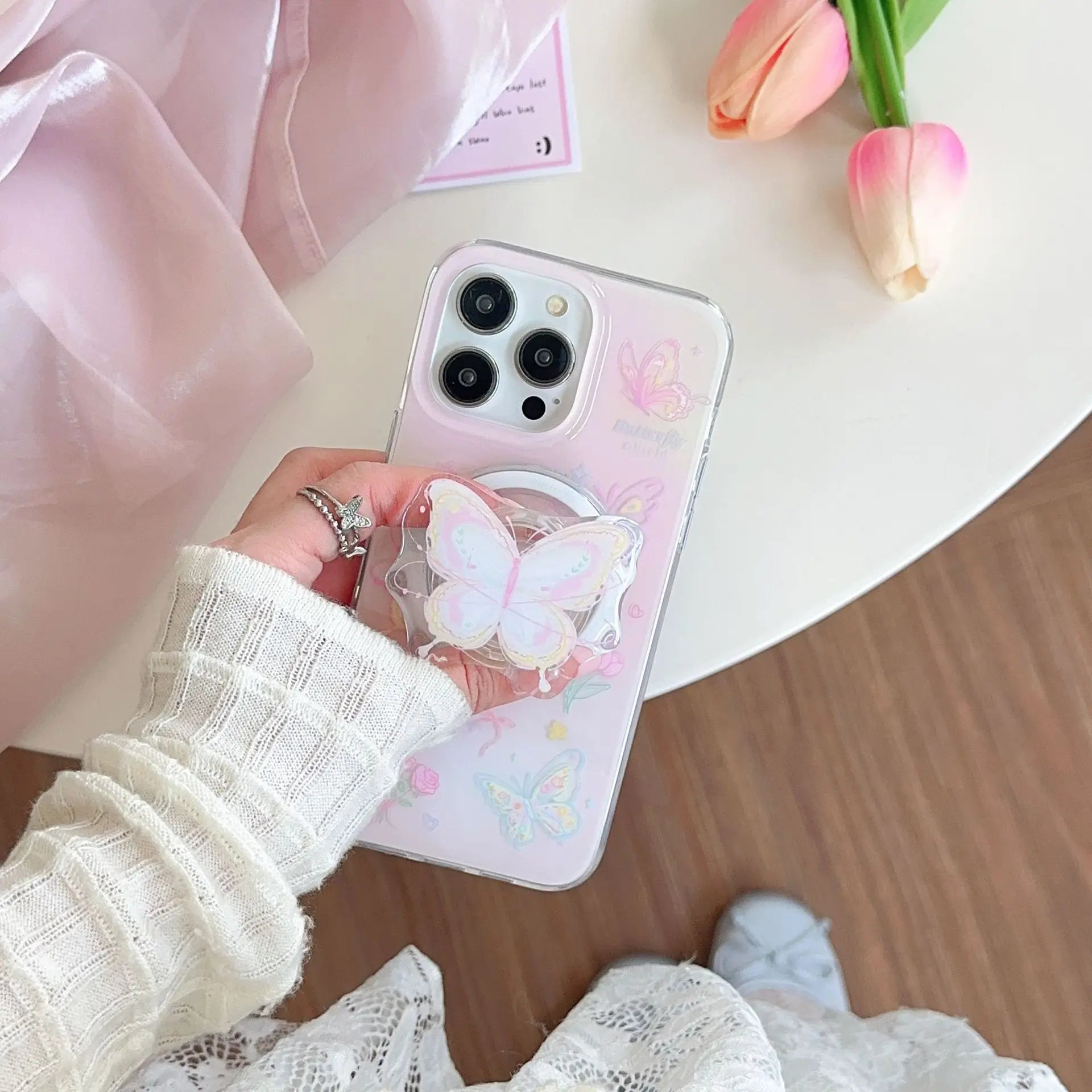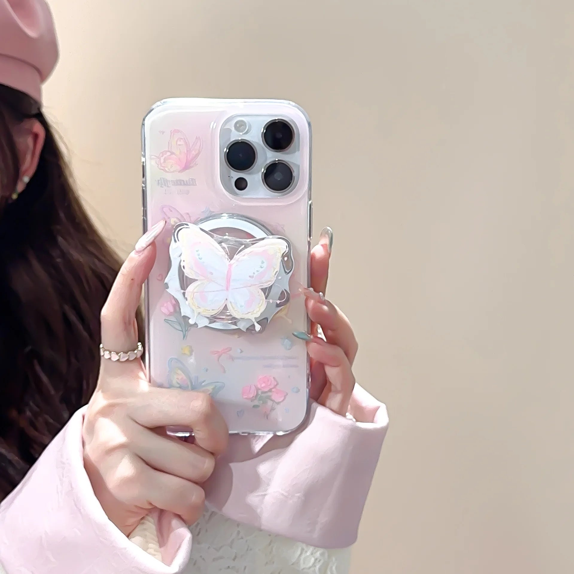 Magnetic rose butterfly phone case with holder For iPhone 11 12 13 14 15 16 17 Pro max