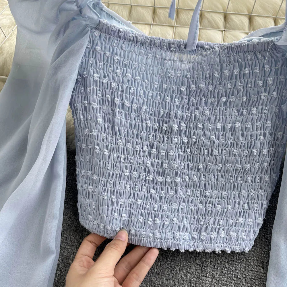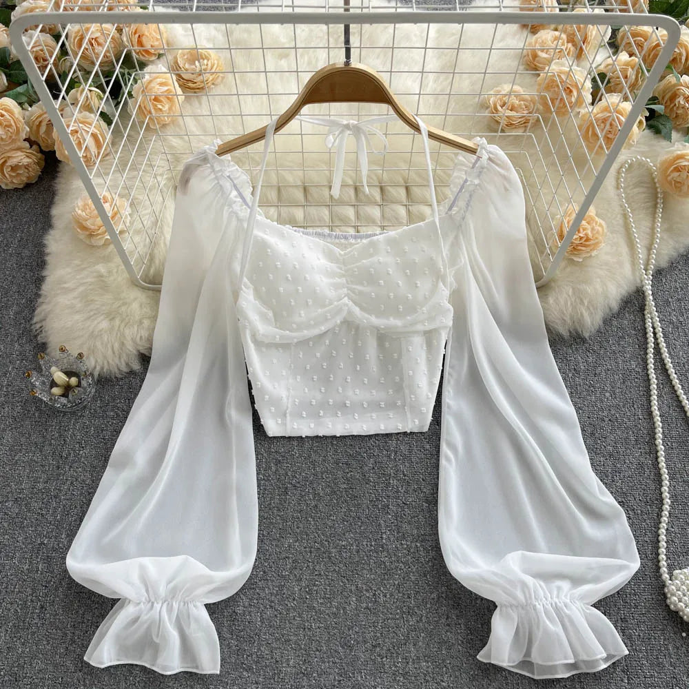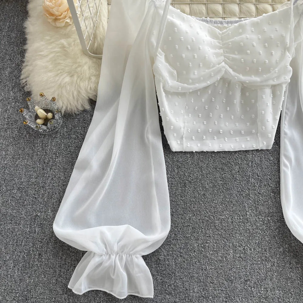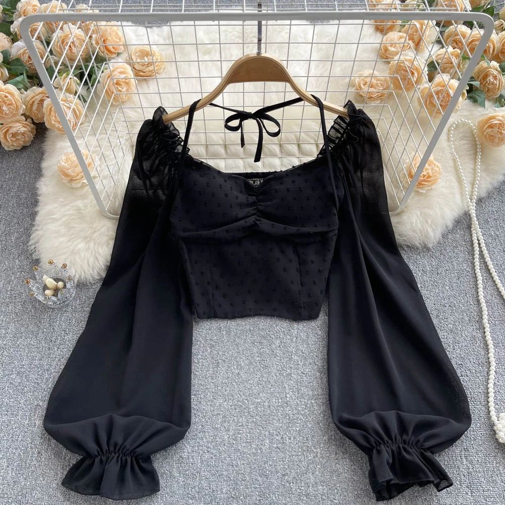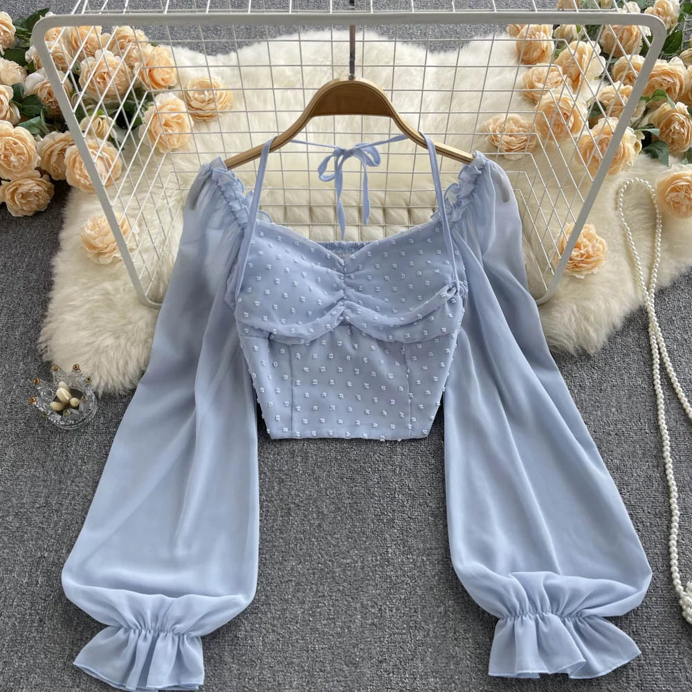 Stay trendy and feminine with this polka dot blouse. Features slash neck, lantern sleeves, and fold decorations — perfect for summer beach outings and casual wear.